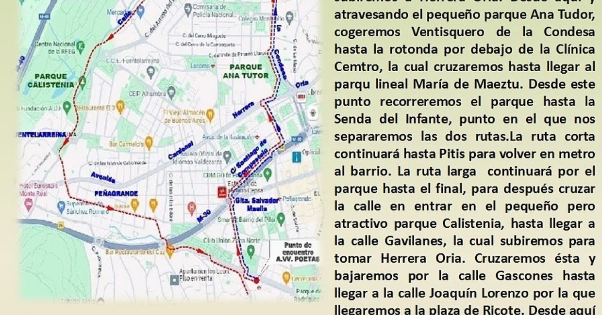 Para el próximo martes 7 de abril realizaremos una ruta circular que nos llevará desde la puerta de nuestra asociación, por Mirasierra hasta Pitis, para regresar por Fuentelareina y Peñagrande hasta llegar finalmente al barrio.