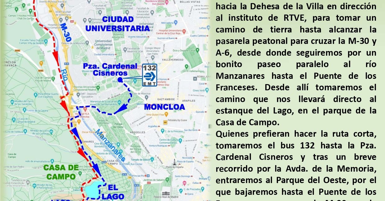 La ruta corta tomará en el bus 132 hasta la Avda. de la Memoria y continuará, ya caminando, por el Parque del Oeste, que atravesaremos hasta el Puente de los Franceses, para cruzar el río y  la M‐30 por la pasarela junto al Polideportivo José María Cagigal y entrar en la Casa de Campo. Desde este punto haremos el mismo recorrido que la ruta larga hasta la estación de metro Lago.