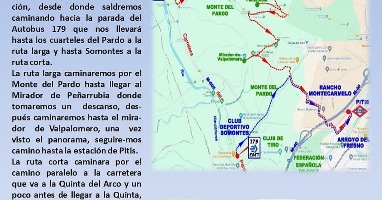 La ruta larga iremos en bus hasta El Pardo, desde donde tomaremos un sendero hacia el Área recreativa y continuaremos por el bosque de encinas y alcornoques, junto al arroyo del Camino Viejo del Pardo a Fuencarral y hasta el Mirador de Peñarrubia. Posteriormente