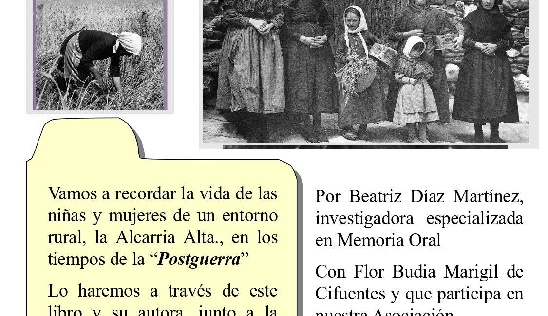 El próximo 21 de enero a las 19:00, en la A.VV. Poetas, volvemos con los miércoles culturales. En esta ocasión vamos a recordar la vida de las niñas y mujeres de un entorno rural de la Alcarria Alta., en los tiempos de la “Postguerra”