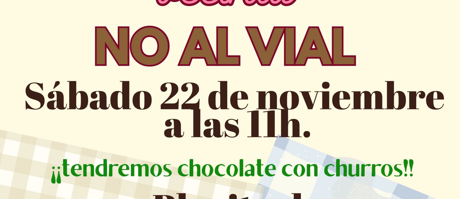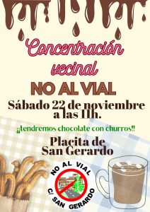 Siguiendo con los actos reivindicativos en contra de la construcción del Vial para tráfico rodado en la calle de San Gerardo, que destruiría la zona infantil, zonas ajardinadas, espacios peatonales y plazas de aparcamiento en superficie, el próximo sábado 22 de noviembre a las 11:00, habrá una concentración vecinal en la que además tomaremos chocolate con churros.