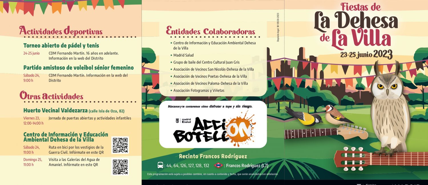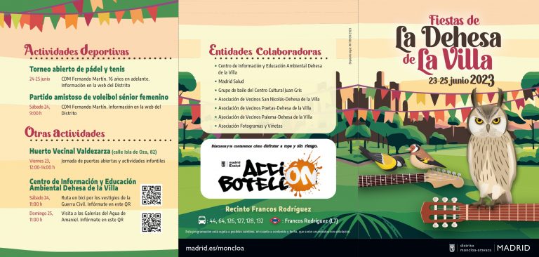 Del 23 al 25 de junio celebraremos las Fiestas de la Dehesa de la Villa 2023. Como otros años, estas fiestas contarán con actividades en varios recintos feriales, si bien el recinto principal estará situado en la calle de Francos Rodríguez, delante del IES Virgen de la Paloma.