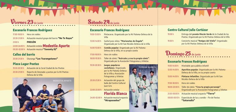 Adjunto os enviamos el programa de las Fiestas de nuestro barrio, que tendrán lugar los días 23, 24 y 25 de junio. En ella se incluyen las actividades que tendrán lugar en la Ciudad de los Poetas.