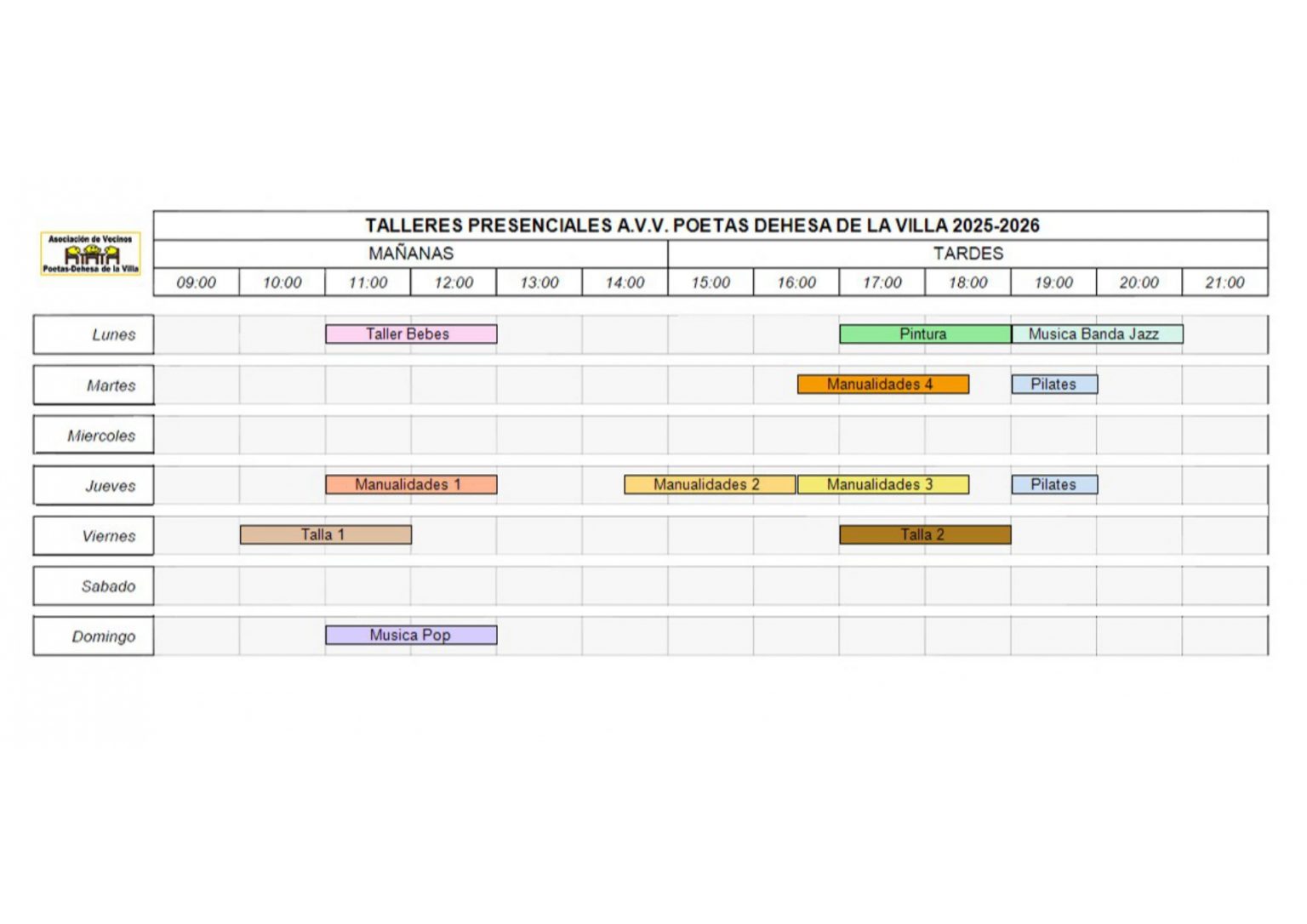 En esta página puedes encontrar el horario de los talleres que actualmente se realizan en nuestro local. Aunque procuraremos tenerlo lo más actualizado posible, te recordamos que es orientativo. Puedes ponerte en contacto con nosotros telefónicamente, por email o presencialmente en nuestra sede.